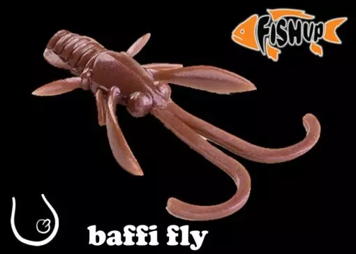 Baffi Fly od společnosti FishUp Lures je umělá aromatizovaná nástraha pro přívlač typu nymfa. Není to však obyčejná nymfa. Její „vousky“ mají velmi realistický pohyb. Doporučený způsob prezentace této nástrahy je za pomocí jigové hlavy, případně čeburašky, o váze 0,5g až 1g. Použití této váhové kategorie zaručuje pomalý propad vodním sloupcem, ideální pohyb vousků nástrahy, a tím pádem zvýšení atraktivity příslušné nástrahy. Můžeme použít například háčky Round Bent Fixative Shank ideálně velkosti 6. Baffi Fly se velmi rychle stala vyhledávanou především závodníky pro lov salmonidů na stojatých vodách. Díky unikátnímu aroma tuto nymfu lososovité ryby dobírají důvěřivě i několikrát za sebou. Sýrovou příchuť nasazený duhák přímo miluje. Díky tomu je to skvělá volba na poslední kola přívlačových závodů!