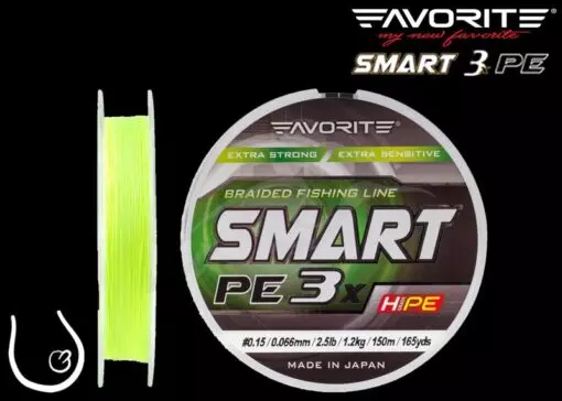Favorite SMART PE 3x je levná, třípramenná šňůra, která může být velmi dobrým kompromisem pro ty, kteří potřebují levnou, ale funkční pletenku. Díky použití materiálu H-Grade PE má tento model optimální měkkost, citlivost a dobrou pevnost v uzlu. Silikonová povrchová úprava zabezpečuje hladký a kluzký povrch, čímž se snižuje tření o očka, zvyšuje se vzdálenost při náhozu a prodlužuje životnost. Zároveň tato povrchová úprava zamezuje nasáknutí vodou. Použití speciální barvy pak zaručuje dlouhodobou barevnou stálost.