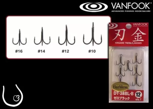 Dnešní moderní přívlač používá také jemné trojháčky šetrné k rybě. Trojháčky Vanfook DT-38 BL jsou bez protihrotu a proto jsou vhodné i pro závodní přívlač. I přes tenký drátek jsou dostatečně pevné i pro souboj s velkými rybami a to především díky špičkové technologii Vanfook. Háčky vydrží ostré dlouhou dobu.
