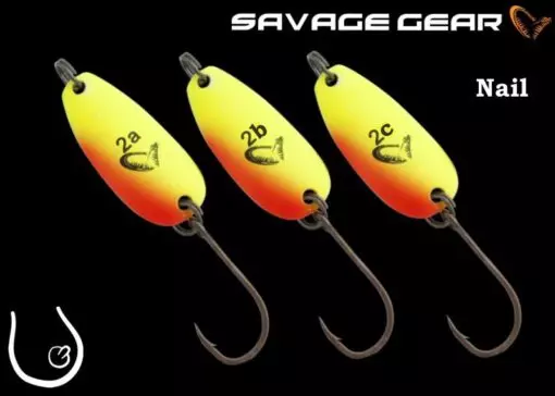 Savage Gear Nail 2, barva Yellow and Red, 28mm, cena za 3 ks, každá plandavka v balení má jinou váhu (2,5g, 3g, 3,5g). Plandavka 3,5g je osazena trojháčkem.
