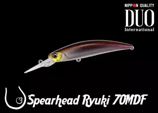 U wobleru SPEARHEAD RYUKI 70MDF jsou všechny tradičně vynikající vlastnosti této řady nástrah ještě vylepšeny o delší lopatku. Tato nástraha je jedním z nejnovějších přírůstků do skupiny SPEARHEAD RYUKI od japonské firmy DUO. Inovativní na této nástraze je délka lopatky a celkově nižší váha. Díky této lopatce wobler pracuje při pomalejším vedení a je jednodušší udržet jej v konstantní hloubce. Díky nižší váze má váhající dravec více času na útok. Toho lze využít například při lovu na řece, kde tuto nástrahu dokážeme nechat splavat pod padlé větve a tím prochytat místa, kam se jinou nástrahou nedostaneme. Nástrahy s označením MDF využívají magnetický systém závaží v podobě těžkých kuliček. Zátěž se během náhozu přesune do zadní části wobleru a pomáhá jej stabilizovat během letu. Zároveň to prodlužuje délku náhozu. Po dopadu na hladinu je tato zátěž opět fixována magnetem. Akce SPEARHEAD RYUKI 70MDF je podobná jako u všech ostatních modelů SPEARHEAD RYUKI. Díky velké lopatce jí však snadněji dosáhneme i na stojatých vodách za použití pomalejšího vedení. Nejúčinnější technikou je vedení krátkými, energickými pohyby prutu (tzv. twitchováním).